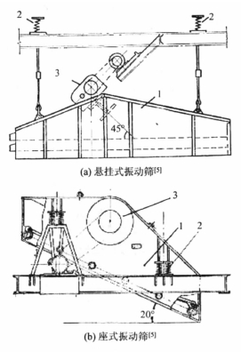 圖1( a) 為掛式振動篩,圖1( b) 為座式振動篩。 篩箱與水平面的傾角為15° - 20°,上面固定有篩網(wǎng)和激振器,篩面可以是單層或多層。篩箱通過彈簧 懸掛或安裝在機(jī)架上。電機(jī)通過皮帶傳動,帶動固定于篩箱上的激振器,從而使篩箱產(chǎn)生振動而工作。