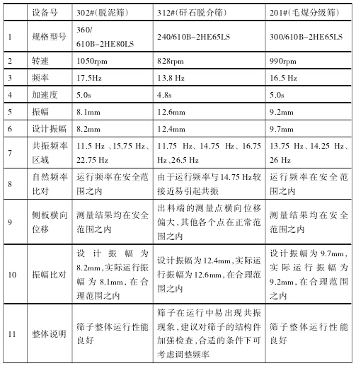 選煤廠重介末矸脫介篩規(guī)格型號(hào)為 BRU-1-240/ 610B-2HE65LS,在設(shè)備啟停過程中,明顯感覺篩箱振幅較大, 現(xiàn)場(chǎng)目測(cè)振幅大約在13mm,2009年下半年篩子的一根支撐彈簧斷裂。2010年5月公司相關(guān)部門技術(shù)人員到選煤 廠對(duì)302#脫泥篩、312#矸石脫介篩和201#毛煤分級(jí)篩進(jìn)行了一 次全面的結(jié)構(gòu)技術(shù)測(cè)評(píng),測(cè)評(píng)數(shù)據(jù)與整體說明統(tǒng)計(jì)如下